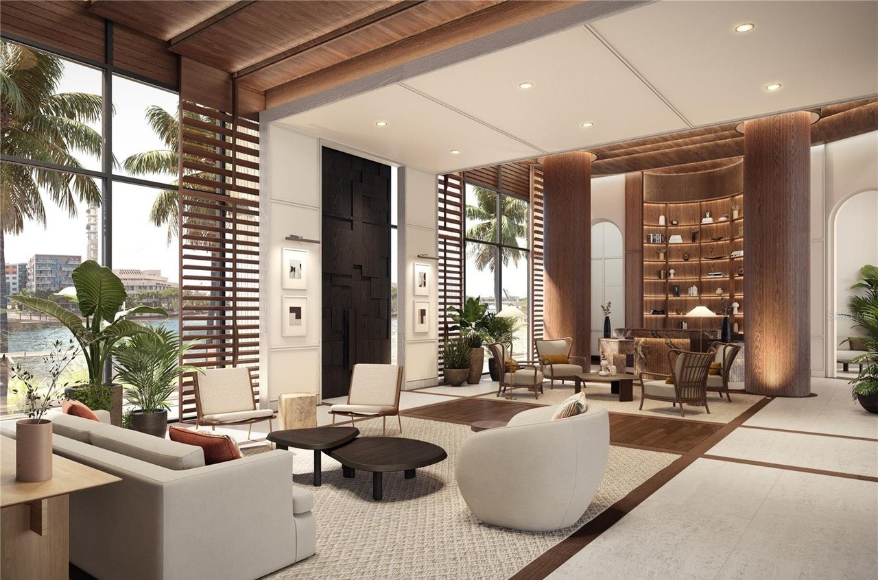 A sprawling waterfront penthouse living room showcasing organic modernism with soaring wood-beamed ceilings, floor-to-ceiling louvered screens, and a curated palette of warm woods, creams, and terracotta accents. The space seamlessly blends indoor-outdoor living with panoramic coastal views, custom built-in shelving, and sculptural furniture arrangements that balance luxury with serene sophistication.