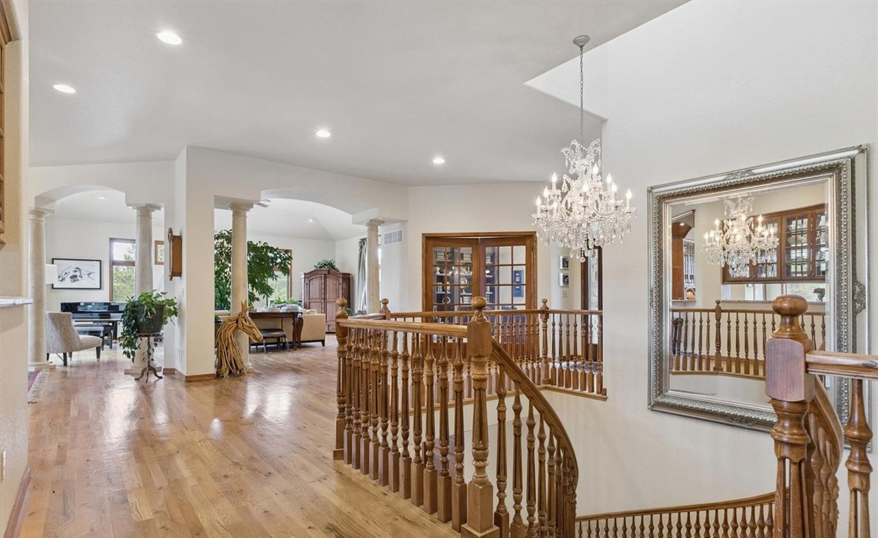 This elegant transitional staircase features turned wood balusters in a warm honey tone and a curved rail, anchored by a dramatic crystal chandelier suspended from a tray ceiling. The space seamlessly connects upper and lower levels with abundant natural light, classic crown molding, and refined brass hardware that balance traditional craftsmanship with contemporary openness.