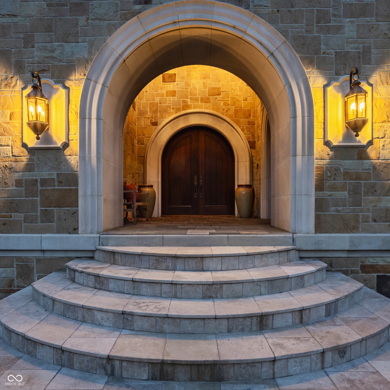 A stunning architectural entryway featuring a dramatic nested arched stone passage with warm golden uplighting that creates theatrical depth and elegance. The symmetrical composition, high-quality stone masonry, bronze lantern sconces, and impeccably finished dark wooden doors convey museum-quality craftsmanship and European-inspired luxury design.
