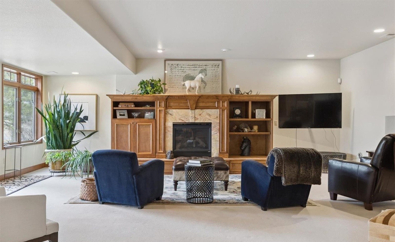 FireplaceBuilt In ShelvingCustom MillworkCrown MoldingRecessed LightingStatement LightingWall Mounted TvFloor To Ceiling WindowsHigh Ceilings