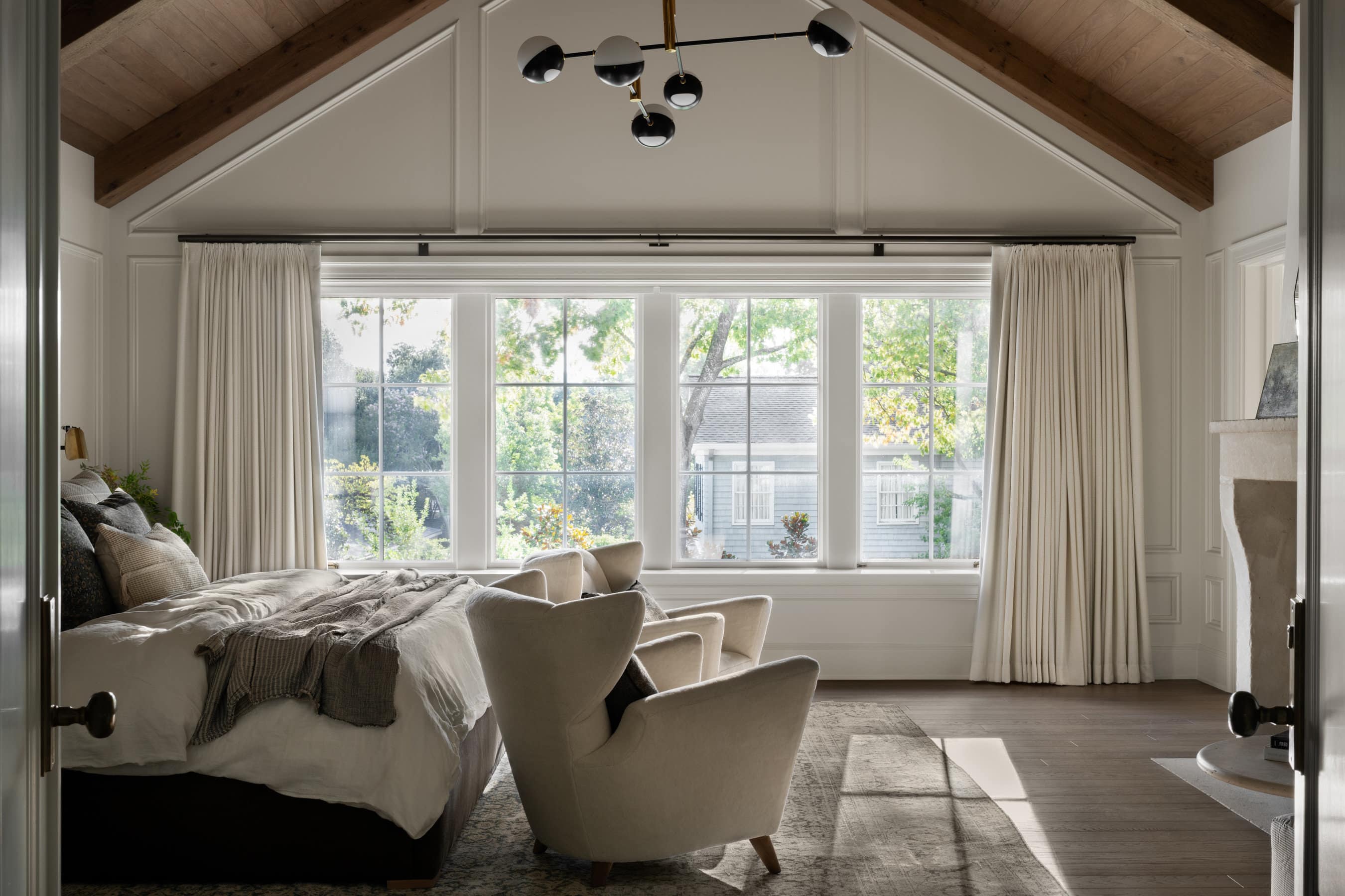 A spacious primary bedroom suite featuring a dramatic vaulted ceiling with exposed natural wood beams, extensive traditional millwork including crown molding and wainscoting, and a stunning wall of windows that floods the space with natural light. The modern chandelier, plush cream seating, and layered neutral textiles create a sophisticated yet serene retreat that balances architectural tradition with contemporary organic comfort.