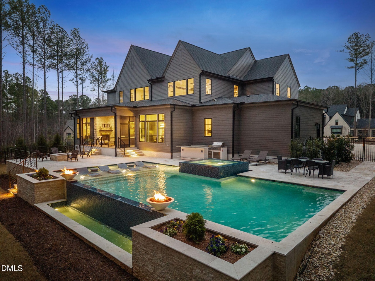 An exceptionally designed luxury resort-style pool area featuring a pristine turquoise pool with adjacent hot tub, integrated fire features, and resort-quality outdoor furnishings set against a contemporary home with dramatic multi-gabled architecture. The sophisticated palette of charcoal, cream, and bronze creates an elegant outdoor living environment with seamless indoor-outdoor flow, professional landscape lighting, and meticulous material selection throughout.