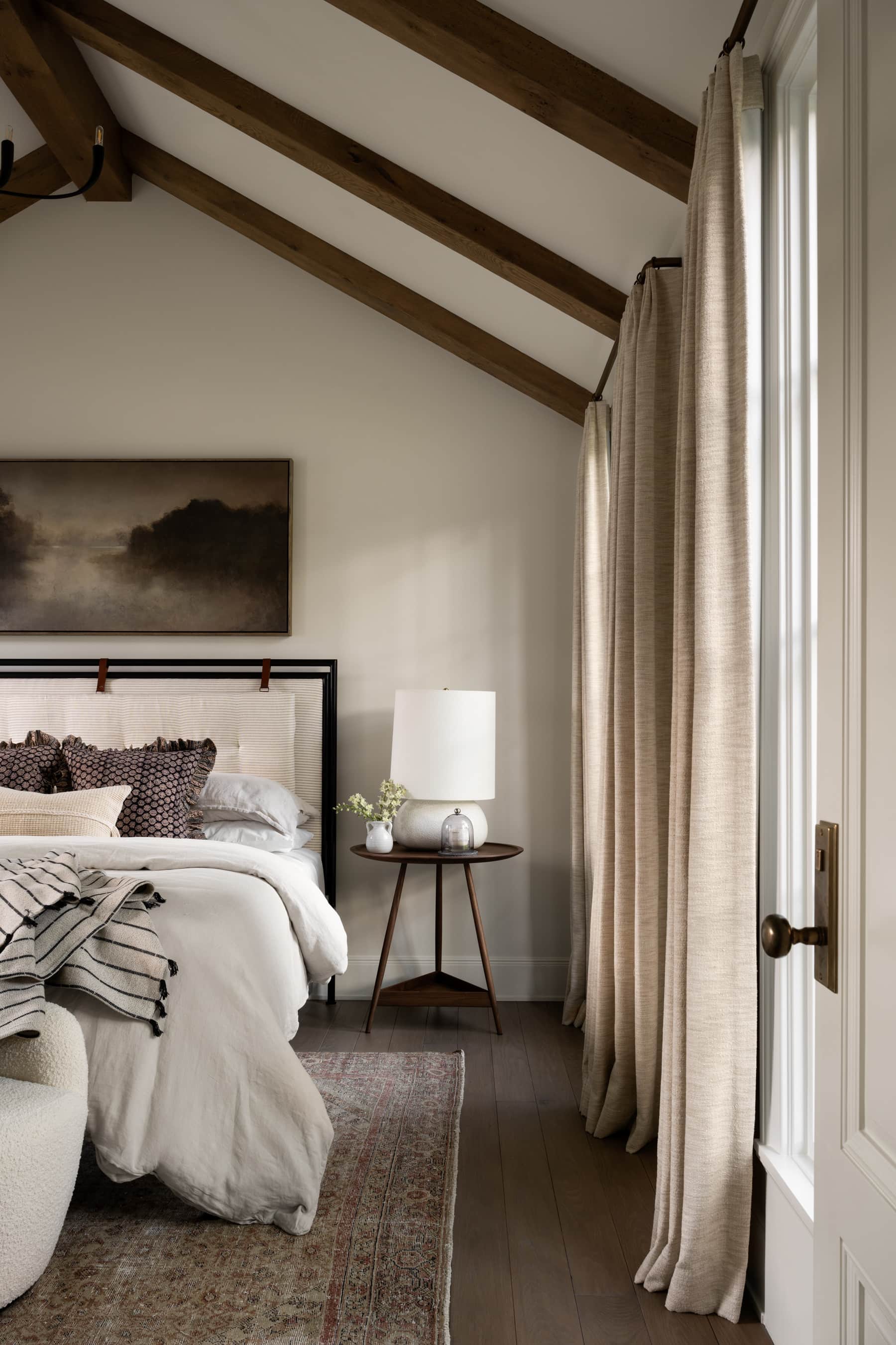 A serene primary bedroom featuring dramatic vaulted ceilings with exposed wood beams and floor-to-ceiling windows draped in natural linen. The space combines traditional architectural elements with organic modern furnishings, including layered neutral textiles, a contemporary upholstered headboard, and mid-century inspired furniture pieces that create a warm, sophisticated retreat.