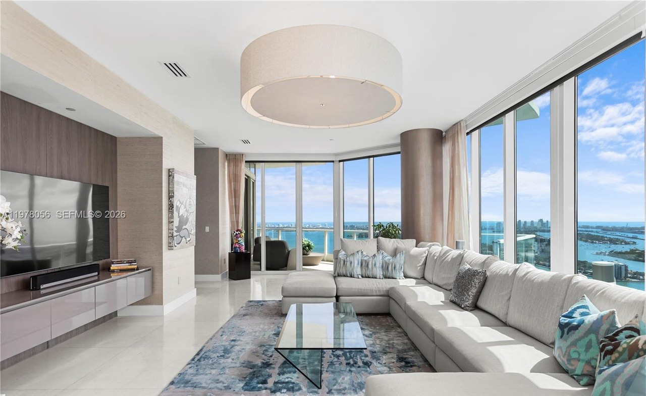 A stunning high-rise living room showcasing floor-to-ceiling panoramic water and cityscape views with a sophisticated palette of cream, white, and gray tones. The space combines organic warmth through layered textures and neutral furnishings with contemporary minimalist restraint, featuring a sculptural ceiling light fixture, marble flooring, and strategically placed accent colors in teal to complement the water views.