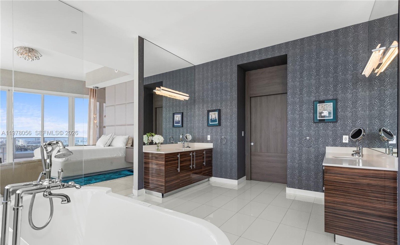 A stunning spa-like primary bathroom featuring a dramatic charcoal textured wallpaper accent wall, floating dark wood vanities with dual white quartz countertops, and a luxurious freestanding soaking tub positioned to capture panoramic waterfront views through floor-to-ceiling windows. The sophisticated design pairs contemporary clean lines with organic warm wood tones, complemented by large-format tile flooring and integrated brass sconce lighting throughout.