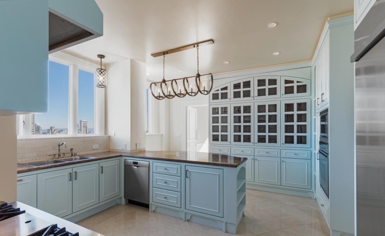 A sophisticated high-end kitchen featuring light blue painted cabinetry with glass-front upper displays, dual islands with waterfall edges, and premium quartz countertops set against marble flooring. The space is flooded with natural light from expansive windows overlooking a city skyline, unified by a tray ceiling with recessed lighting and anchored by an elegant bronze chandelier and coordinating fixtures.