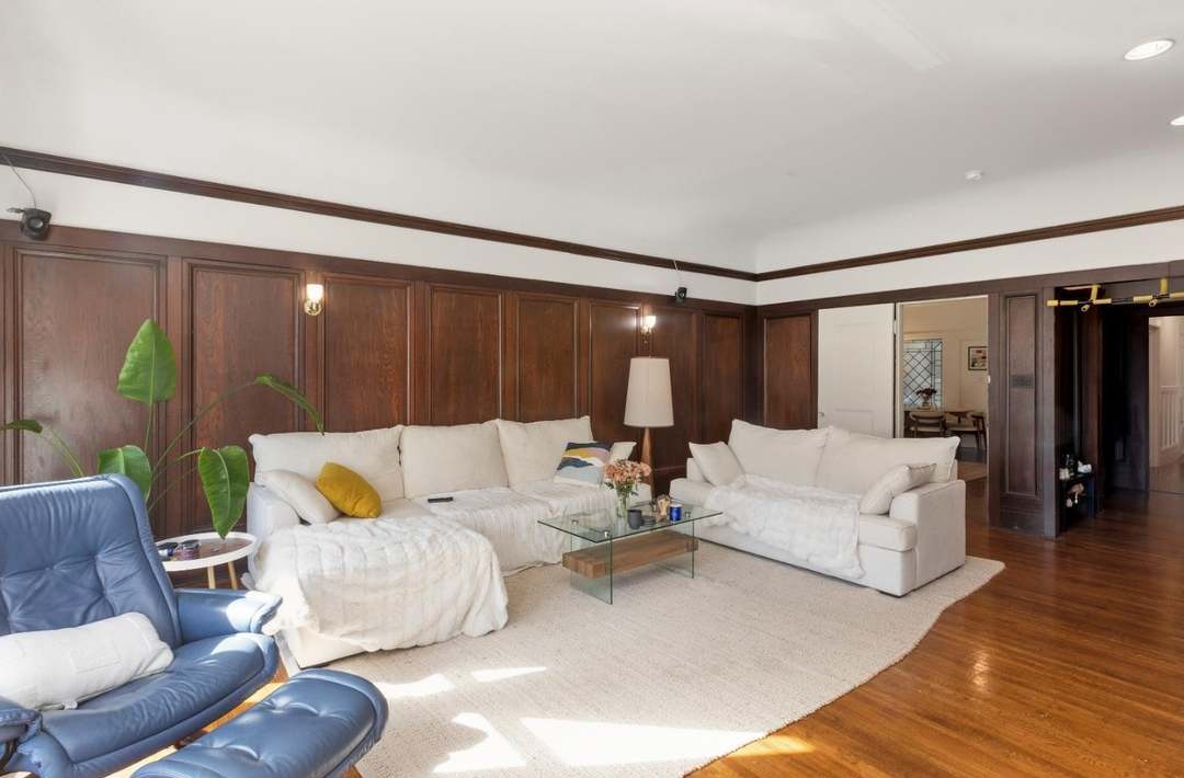 A sophisticated transitional family room featuring rich dark wood paneling, beamed ceilings, and custom millwork that creates a warm, enveloping luxury aesthetic. The space masterfully combines traditional architectural elements with contemporary comfort through layered neutral upholstery, curated accent pieces in mustard and slate tones, and abundant natural light that enhances the room's serene, collected elegance.