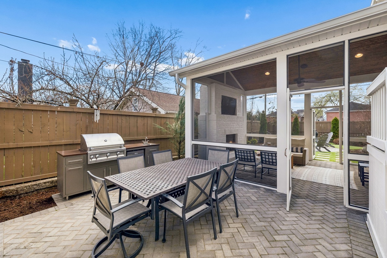 Outdoor KitchenBuilt In GrillCovered PatioOutdoor Dining TableFloor To Ceiling WindowsFireplacePergola OverhangStatement LightingCustom Cabinetry