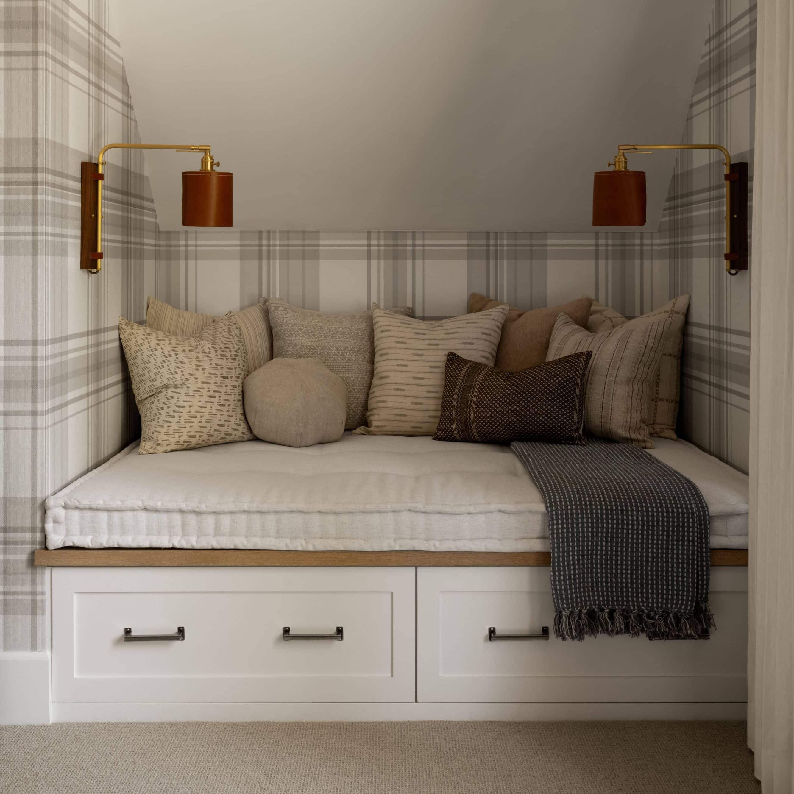 A sophisticated built-in daybed nook features white shaker-style storage drawers beneath a plush cushioned seating area adorned with layered neutral pillows and a charcoal throw. Warm brass swing-arm sconces with brown cylindrical shades flank the space, while a refined plaid wallpaper creates an enveloping, cozy atmosphere perfect for reading or lounging.