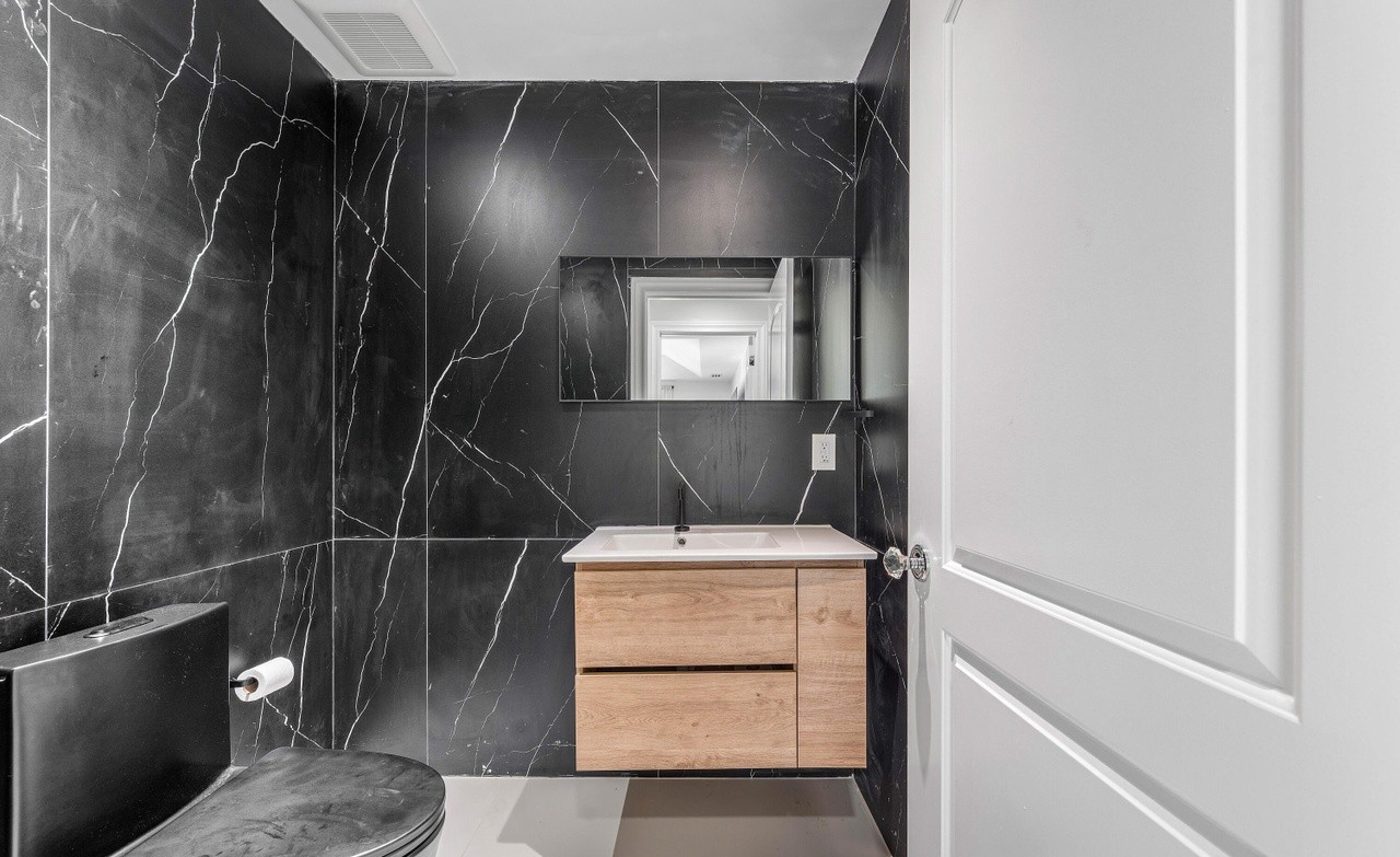 A striking contemporary primary bathroom featuring dramatic black marble-veined large-format wall tiles paired with a natural wood floating vanity and white quartz countertop. The minimalist design is elevated by clean geometry, chrome fixtures, and a sophisticated monochromatic palette that creates an air of understated luxury.