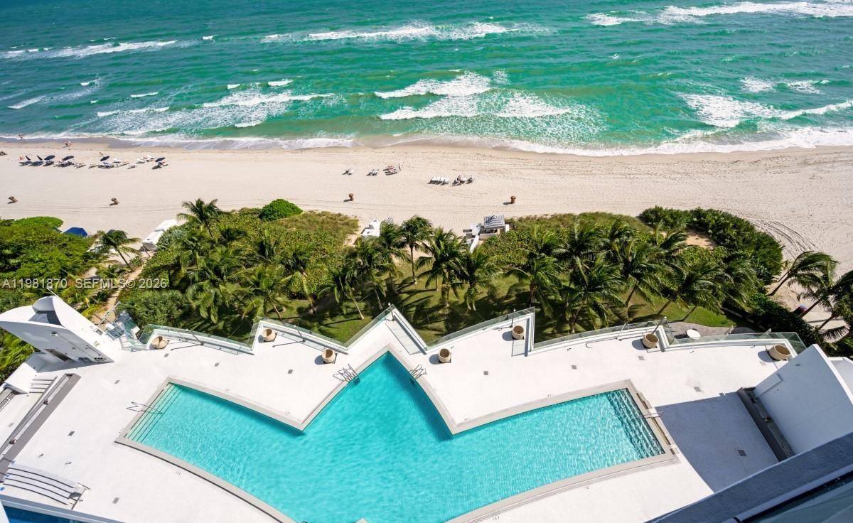 An ultra-luxury beachfront pool area featuring a stunning turquoise lap pool with white sun decks overlooking pristine white sand and vibrant turquoise ocean waters. The sophisticated design seamlessly blends resort-style elegance with direct beach access, complete with lush tropical landscaping and premium lounge seating.