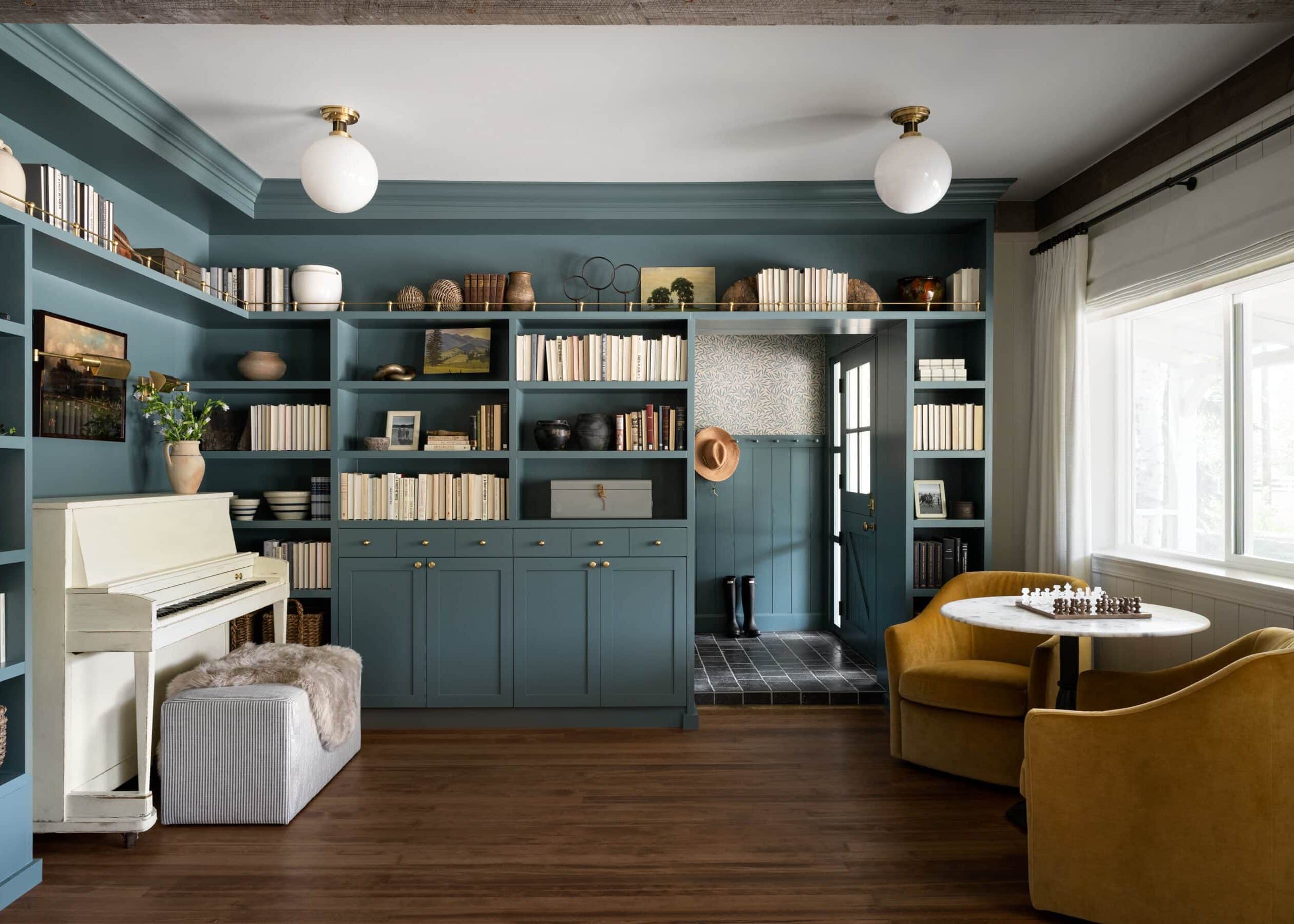 A sophisticated library featuring floor-to-ceiling teal blue built-in cabinetry with brass hardware, housing a curated collection of neutral-toned books alongside a white piano and mustard yellow velvet seating. The rich color palette and custom millwork create an intimate yet refined space flooded with natural light from large windows.