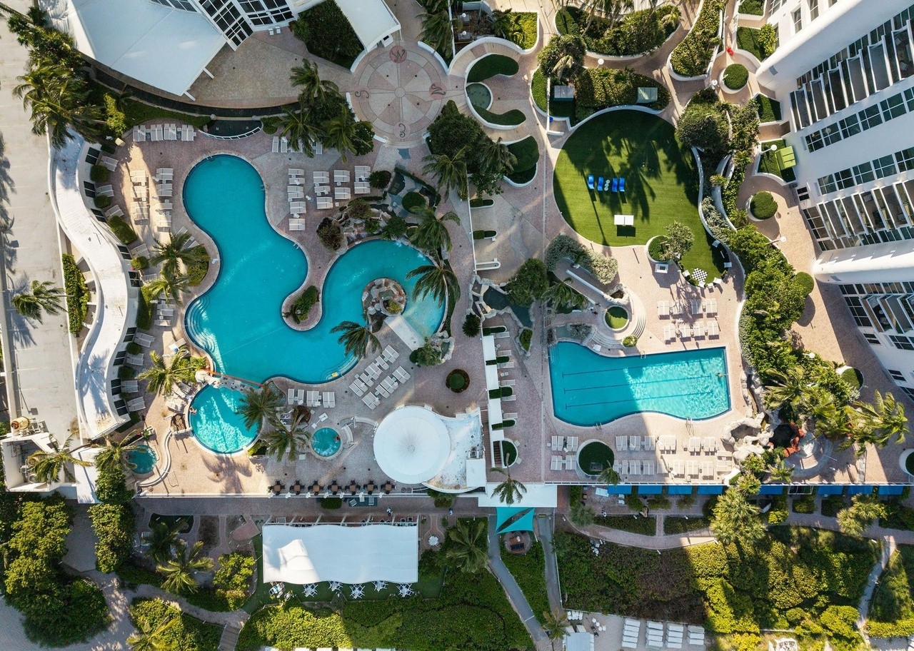 An expansive resort-style pool complex featuring multiple zero-edge pools with turquoise water, sculptural spa areas, and organic curved shapes, surrounded by lush tropical landscaping and lounge seating. The sophisticated aerial composition showcases premium resort amenities with stunning landscape integration and professional design execution.