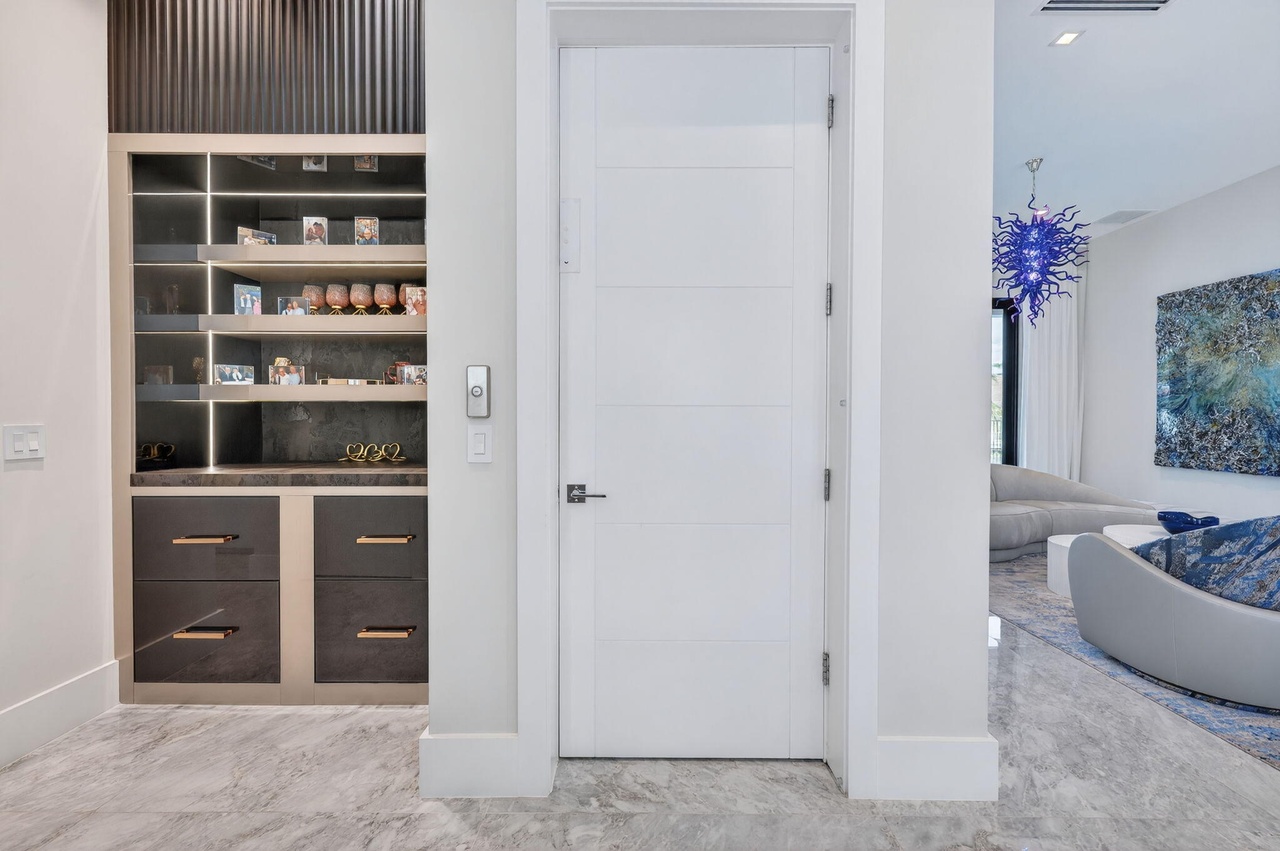 A sophisticated modern hallway gallery featuring a striking floor-to-ceiling shelving unit with dark painted cabinetry, brass hardware, and illuminated glass shelving that displays curated art and accessories. The space showcases luxury finishes including marble flooring, clean white walls, and a seamless transition to adjoining rooms, epitomizing contemporary luxury residential design with subtle traditional molding details.