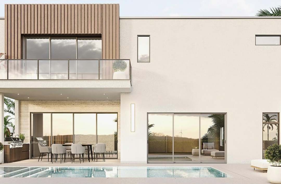 A stunning ultra-luxury resort-style poolside living space seamlessly integrating indoor and outdoor entertainment, featuring a heated swimming pool, sophisticated patio lounge seating, and a covered dining area with modern slatted wood screening and floor-to-ceiling glass walls. The design showcases warm earthy materials—natural wood cabinetry, cream-toned stone, and concrete flooring—paired with minimalist black hardware and integrated landscape planting, creating a serene, gallery-like atmosphere that blurs the boundary between interior and exterior living.