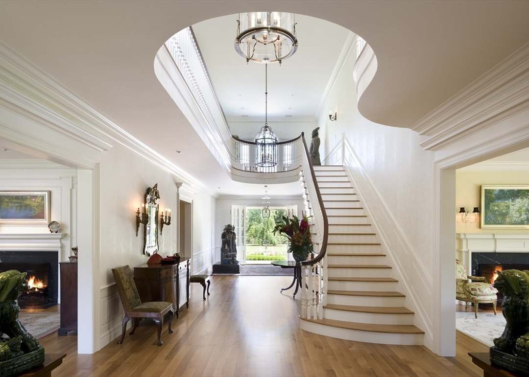 This spectacular two-story entry hall showcases museum-quality classical design with a sweeping curved staircase, dramatic coffered barrel-vault ceiling, and abundant natural light from tall windows framing manicured grounds. The sophisticated palette of cream, white, and dark wood stair detailing epitomizes East Coast luxury with impeccable proportions and bespoke architectural details.