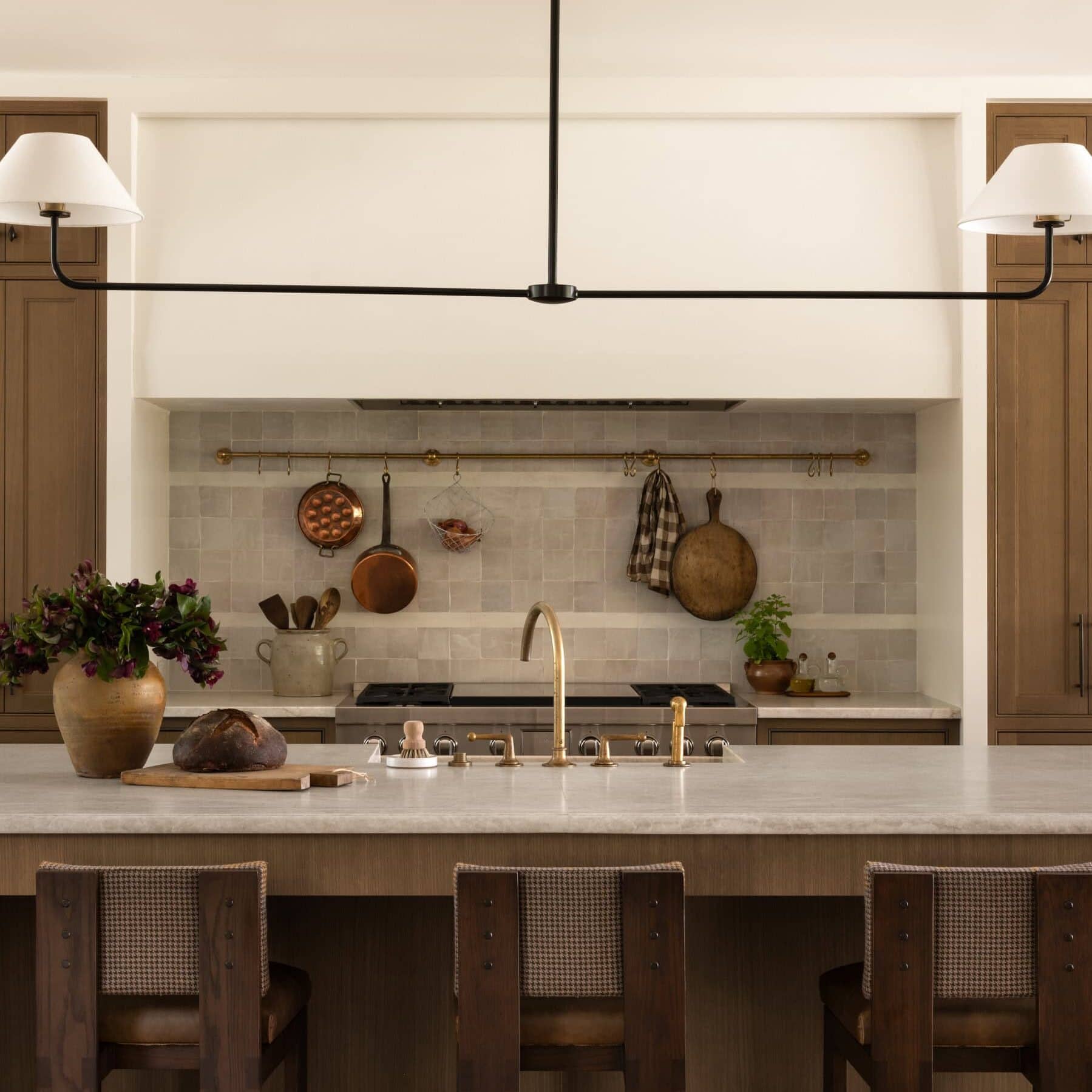 A sophisticated transitional kitchen featuring a substantial waterfall-edge island with a light quartzite countertop, natural wood cabinetry, and warm brass hardware that contrasts beautifully with the creamy walls and large-format ceramic tile backsplash. The space achieves understated luxury through carefully curated vintage-inspired details—copper cookware, a bold linear pendant light, and layered textures—while maintaining clean modern lines and excellent natural light.