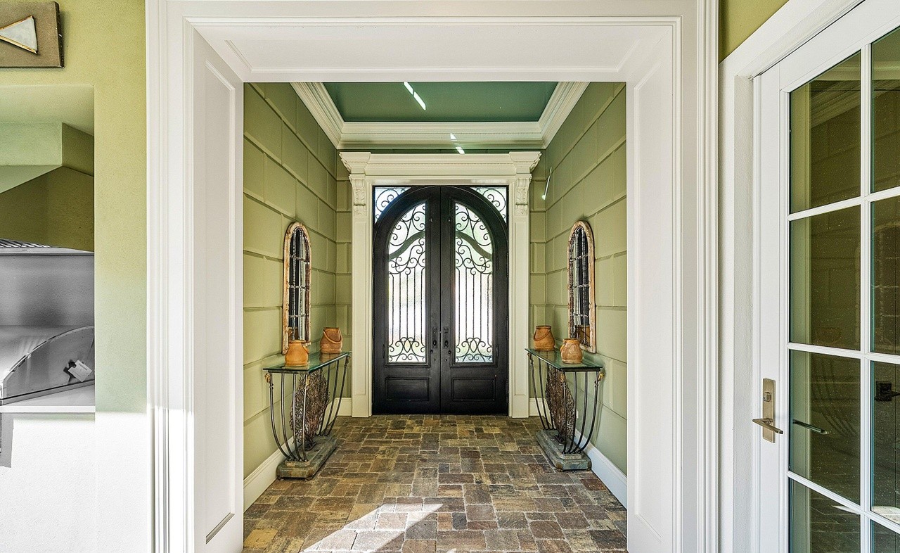 An elegantly appointed entryway featuring a sophisticated green and cream color palette with ornate wrought-iron double doors as a striking focal point. The space showcases refined traditional architecture—coffered ceiling, wainscoting, and crown molding—paired with curated decorative accessories and premium stone flooring, creating a grand yet welcoming first impression.