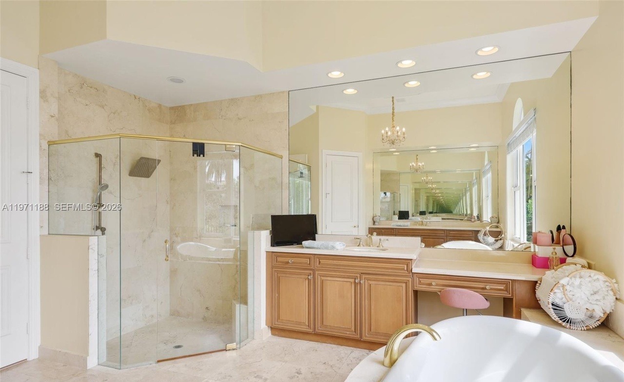 This expansive primary bathroom showcases classic luxury with a transitional design aesthetic, featuring coordinated cream and beige marble throughout, a sculptural freestanding soaking tub positioned as a focal point, and a generous walk-in shower with frameless glass enclosure. The warm lighting, brass hardware, ornamental chandeliers, and double vanity with natural wood cabinetry create an inviting, spa-like sanctuary that balances traditional elegance with contemporary comfort.