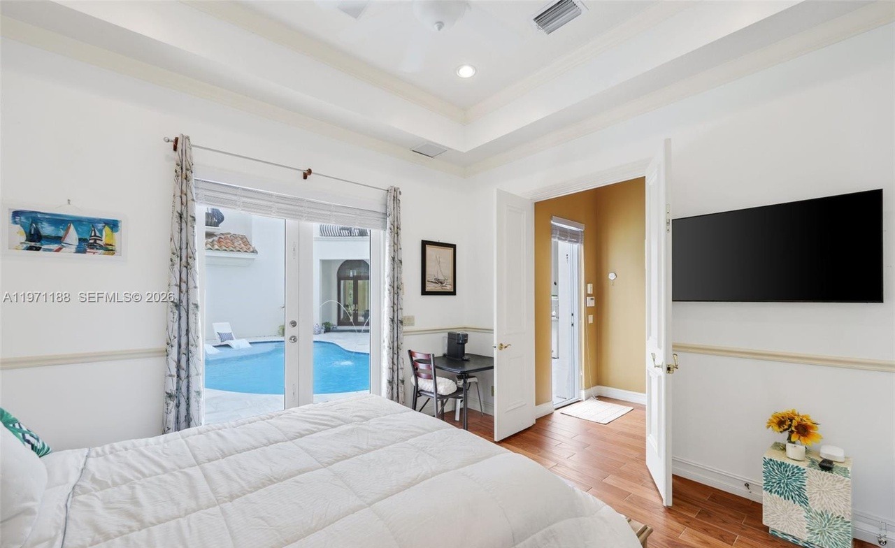A sophisticated coastal-transitional primary bedroom featuring abundant natural light with direct pool views through glass doors, anchored by a white upholstered bed and complemented by refined architectural details including coffered ceilings and wainscoting. The warm neutral palette with soft blue and gold accents creates a serene, resort-like atmosphere enhanced by quality hardwood flooring and brass hardware.
