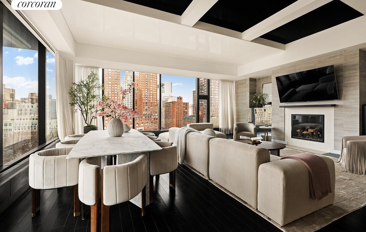 A stunning high-rise living room featuring a coffered ceiling, floor-to-ceiling windows with panoramic urban views, and a sophisticated palette of cream, white, and black accents. The space seamlessly blends contemporary comfort with transitional architectural details, anchored by a gas fireplace and furnished with curated modern seating in natural linen tones.