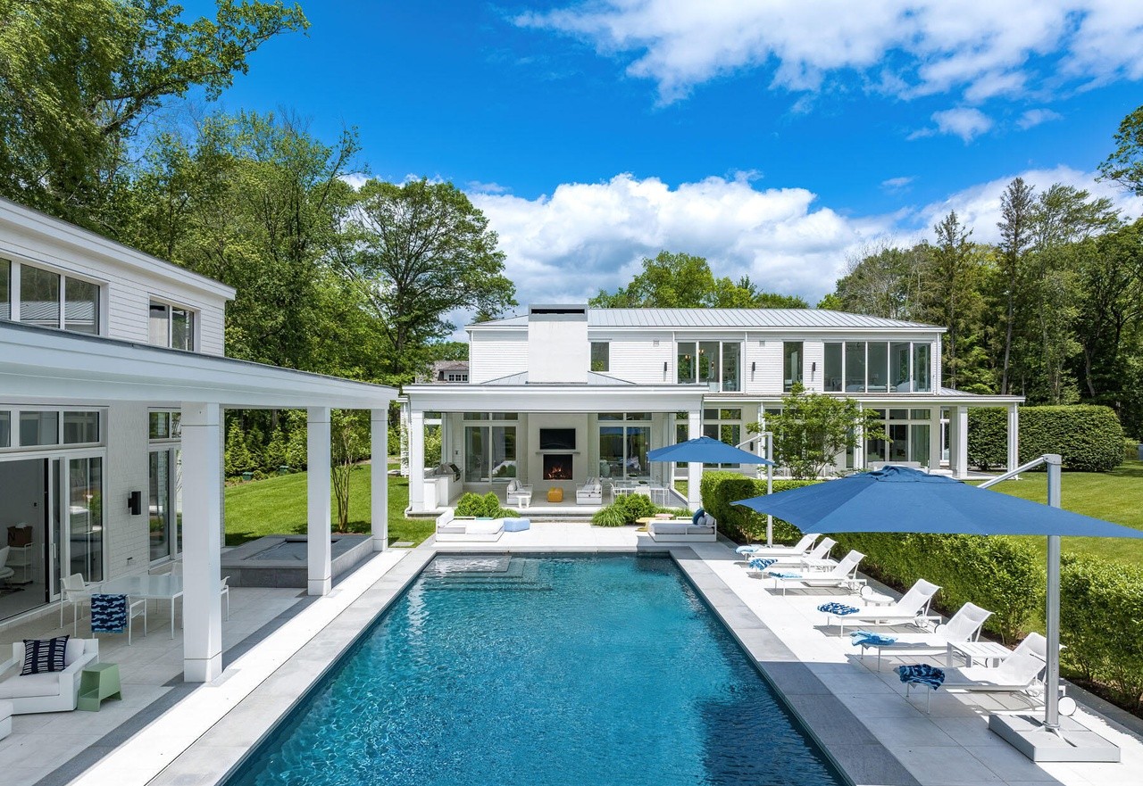 A stunning ultra-luxury pool retreat featuring a pristine rectangular lap pool with turquoise water, flanked by white lounge seating and a blue cantilevered umbrella, overlooking manicured lawns and a modern white house with extensive glass walls and a covered patio with fireplace. The composition balances contemporary minimalism with Hamptons elegance, emphasizing clean lines, abundant natural light, and seamless indoor-outdoor living.
