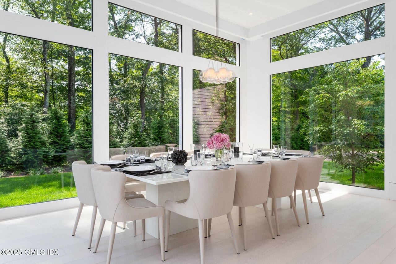 A stunning organic modern dining room with floor-to-ceiling windows framing mature forest views, featuring a sculptural white dining table paired with cream upholstered chairs and a delicate cloud-like pendant light. The serene palette and seamless integration of interior and landscape create an editorial-quality space that prioritizes natural light, materiality, and refined restraint.