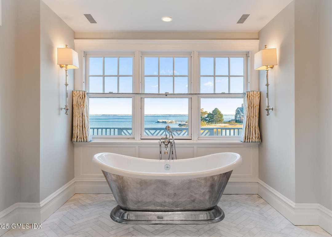 An exceptionally luxurious waterfront bathroom featuring a dramatic freestanding metal-exterior tub positioned to capture expansive water views through triple-pane windows with custom millwork. The serene palette of whites, creams, and soft grays is enhanced by marble flooring, wainscoting, and refined brass sconces, creating a spa-like sanctuary with timeless coastal elegance and magazine-worthy composition.