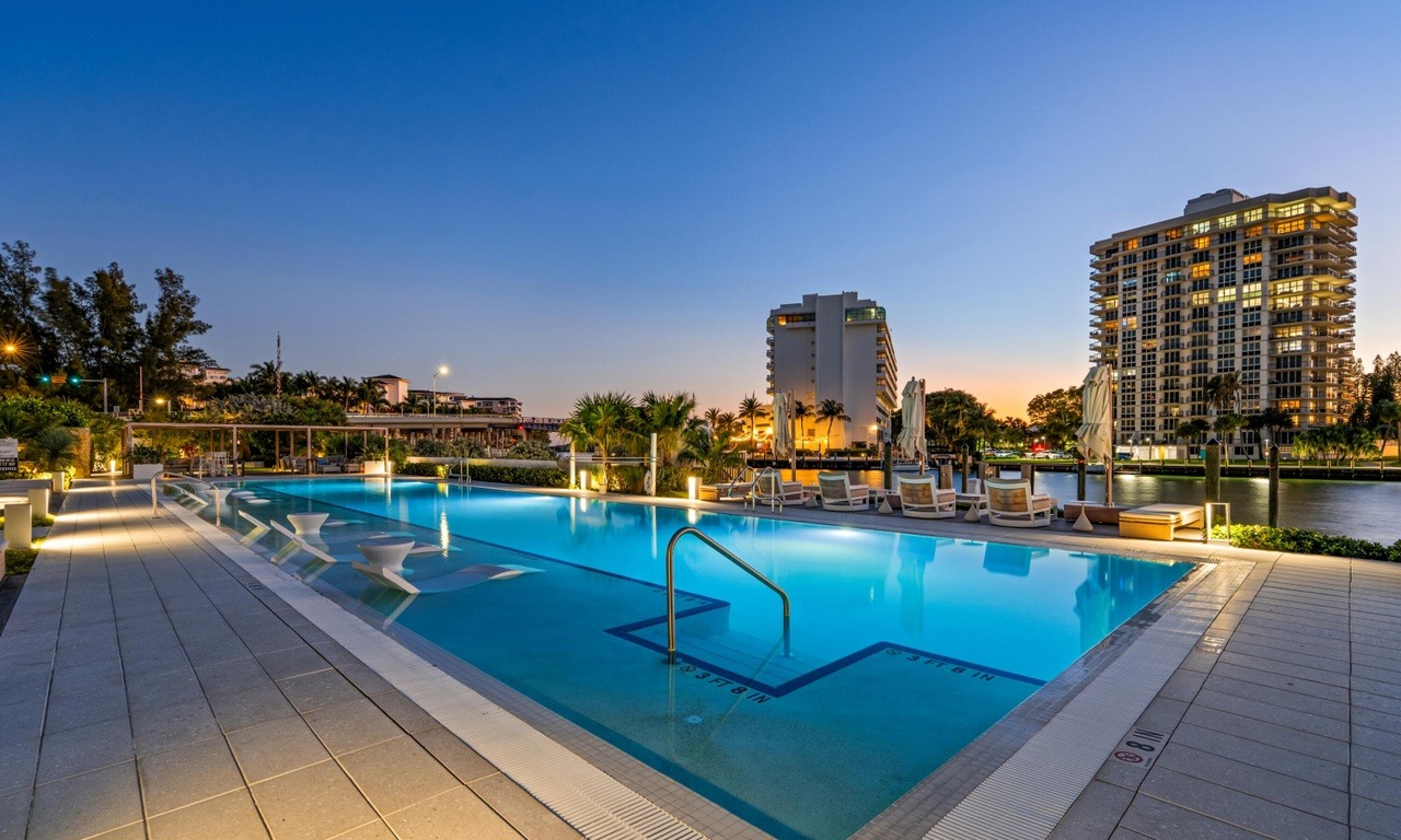 A stunning resort-style pool area overlooking a serene waterfront, featuring elegant lounge seating, sculptural white umbrellas, and premium stone decking illuminated by warm accent lighting at dusk. The sophisticated design seamlessly blends organic modern aesthetics with coastal luxury, creating an inviting yet refined outdoor entertaining space.