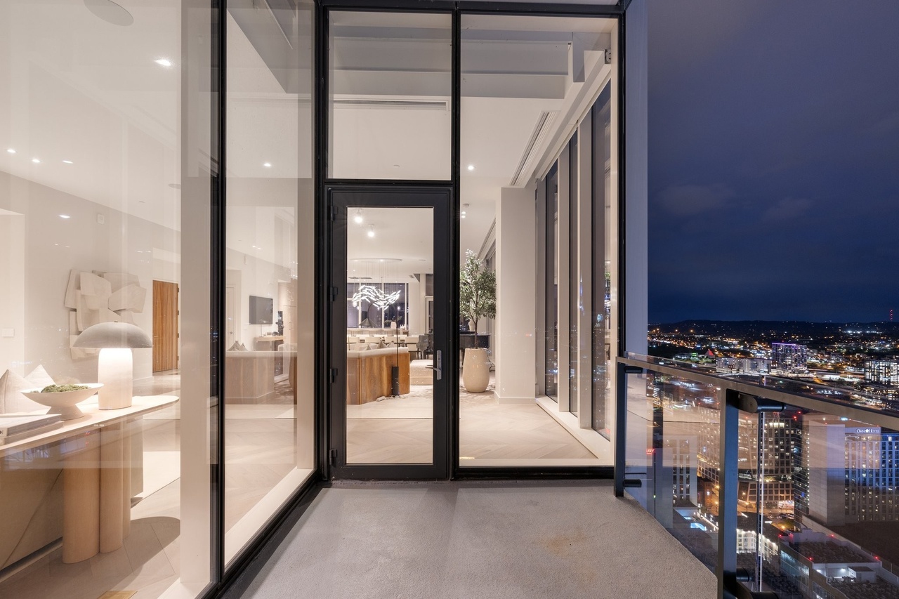 Floor To Ceiling WindowsGlass Sliding DoorsGlass RailingHigh CeilingsPanoramic City ViewsMinimalist FurniturePotted PlantStatement Lighting