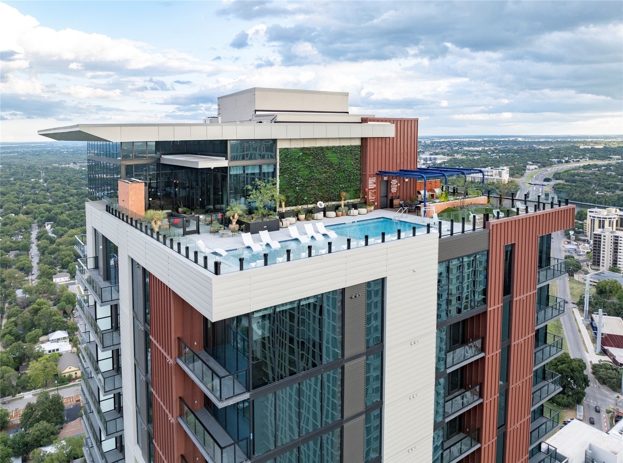 A stunning rooftop pool area with resort-style sophistication, featuring a saltwater pool with lounge seating, integrated outdoor kitchen with living green walls, and sweeping panoramic views of lush landscape. The design seamlessly blends clean contemporary architecture with warm organic materials—terracotta steel cladding, natural plantings, and earth-toned furnishings—creating an elevated outdoor sanctuary that feels both grand and inviting.