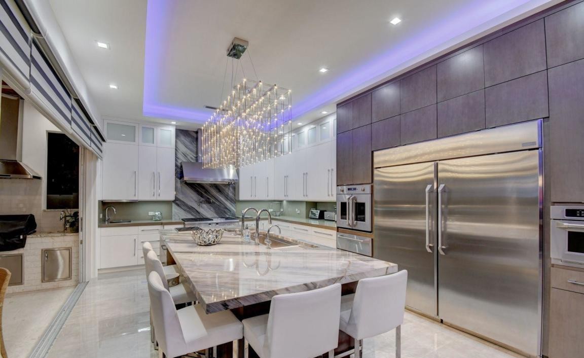 A stunning contemporary luxury kitchen featuring a dramatic marble waterfall island, white flat-panel cabinetry, and high-end stainless steel appliances accented by a striking geometric black marble backsplash. Purple ambient ceiling lighting and a crystal chandelier add glamorous theatrical elements to the sophisticated open-concept space with crown molding and high ceilings.