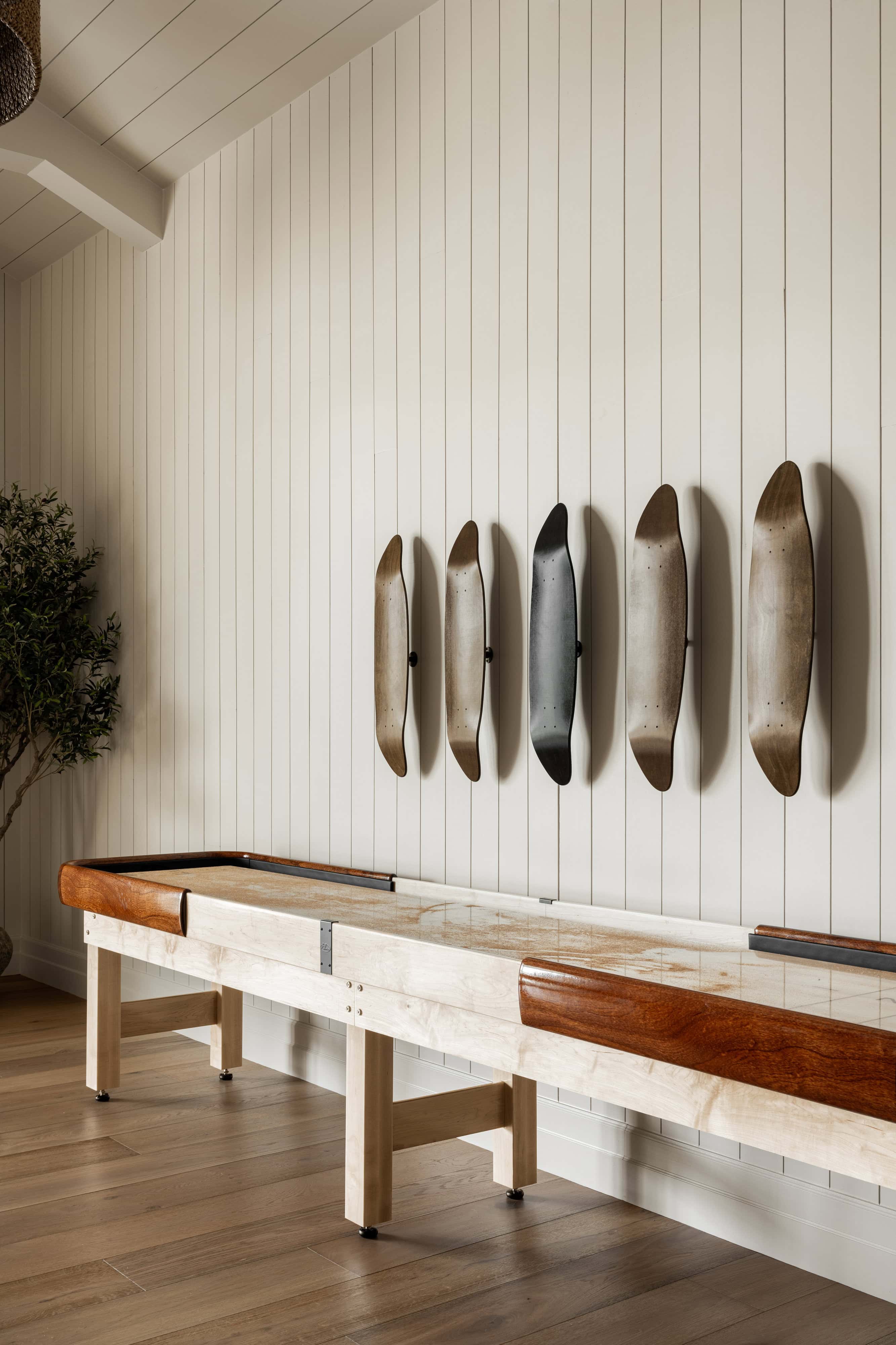 A serene coastal game room featuring a custom shuffleboard table with rich wood ends and a striking wall display of vintage surfboards against vertical white paneling. The vaulted ceiling and warm wood flooring create an airy, beach-house atmosphere that balances casual recreation with refined coastal design.