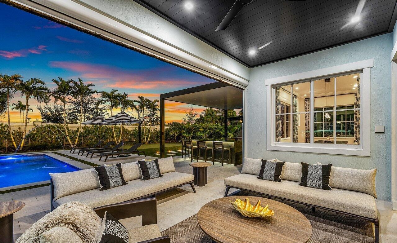 Covered PatioPoolOutdoor Lounge SeatingFloor To Ceiling WindowsPergolaAccent LightingFirepit NearbyMature LandscapingPalm TreesSunset Views