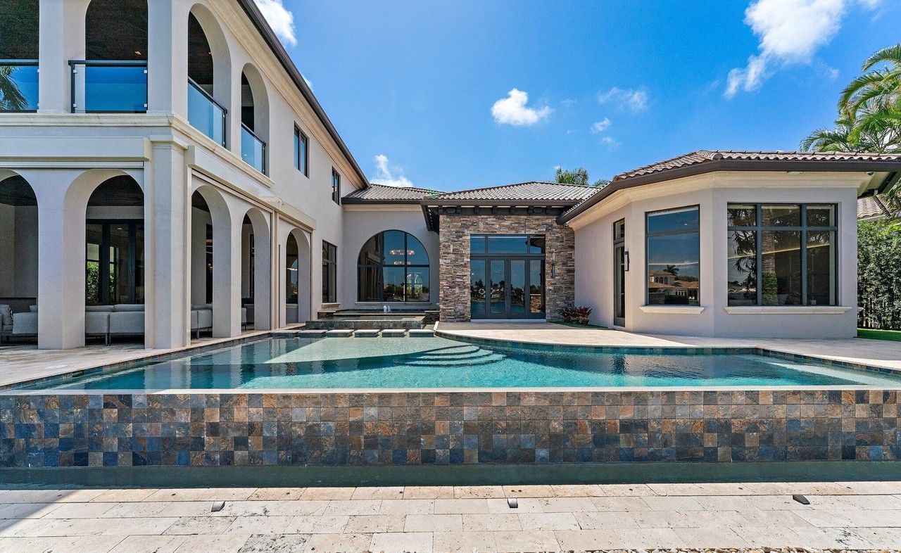 An exceptional resort-style courtyard pool featuring pristine turquoise water framed by elegant white stucco architecture with classical arched openings and decorative mosaic tile waterline detail. The space seamlessly blends Mediterranean and modern design with travertine stone decking, columned portals, and expansive glass walls that dissolve the boundary between indoor and outdoor living in this ultra-luxury estate.