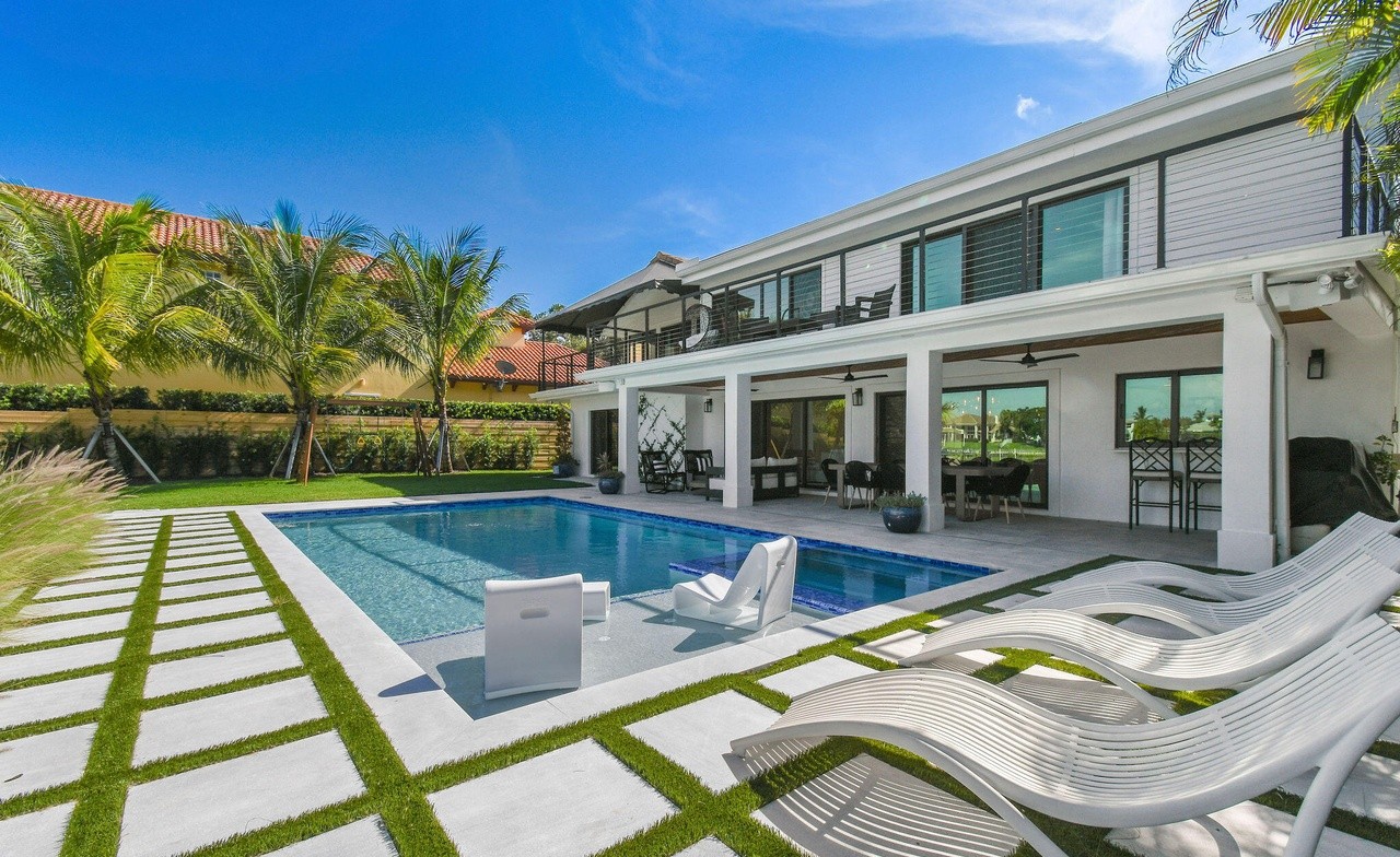 An ultra-luxury modern poolside retreat featuring a pristine rectangular pool with integrated spa seating, bordered by expansive white concrete pavers with integrated lawn strips. The minimalist aesthetic is anchored by a sophisticated white modern home with floor-to-ceiling black-framed glass doors, covered patio seating, and white lounge chairs, creating a serene yet sophisticated outdoor living sanctuary with abundant natural light and seamless indoor-outdoor flow.