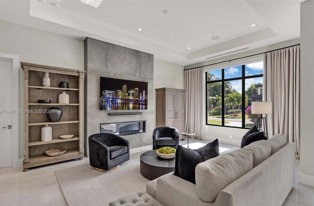 A sophisticated family room featuring a stunning concrete fireplace wall, built-in light wood shelving, and a carefully curated seating arrangement of cream and black upholstered pieces anchored by a dark marble cocktail table. The space epitomizes contemporary luxury with floor-to-ceiling windows framing manicured tropical landscaping, neutral tones, refined custom millwork, and professional lighting design that creates an elegant yet inviting sanctuary.