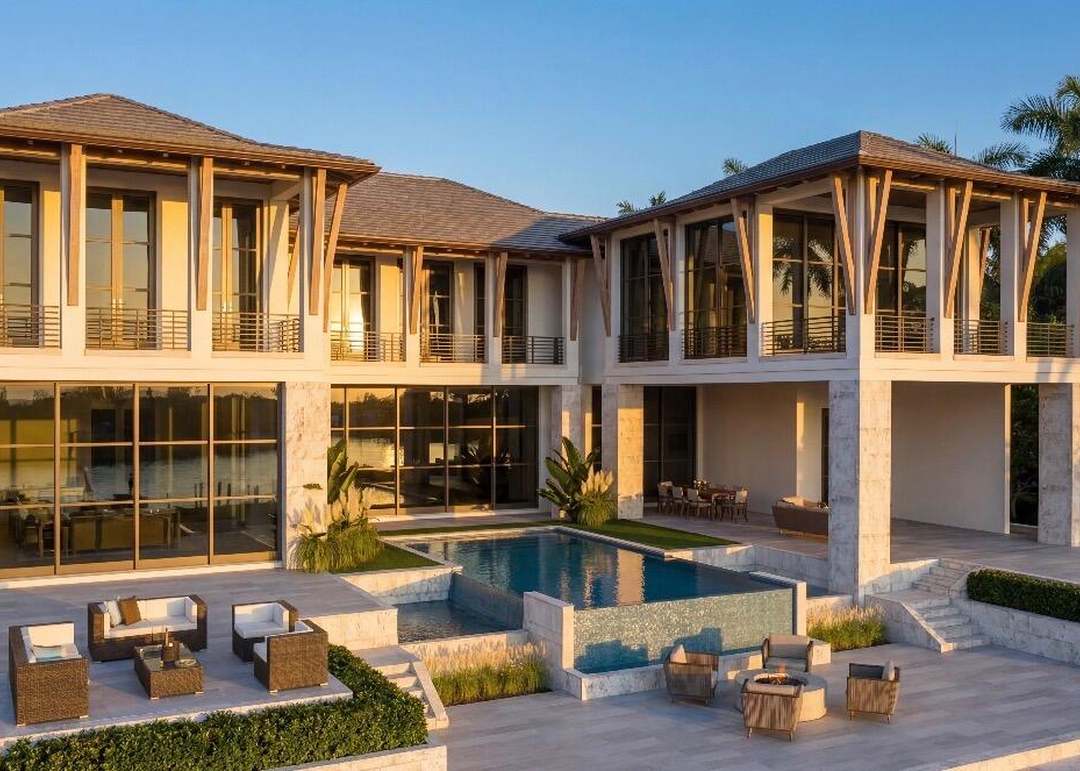 A stunning ultra-luxury resort-style pool area featuring a custom geometric pool with stone paver decking, integrated lounge seating with warm-toned furniture, and multiple covered pergola structures with brass railings that frame the sophisticated outdoor living space. The warm cream and white palette, combined with natural materials and open-concept indoor/outdoor flow, epitomizes contemporary desert modern design at the highest level.