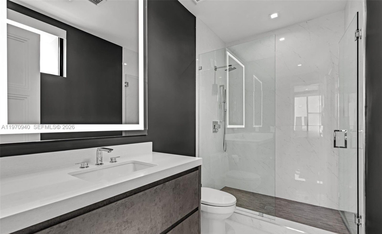 A sleek, contemporary primary bathroom featuring a floating gray vanity with white quartz countertop, oversized lighted mirror, and an expansive frameless glass walk-in shower with marble tile surround. The monochromatic palette of whites, grays, and blacks with chrome accents creates a clean, sophisticated spa-like atmosphere.