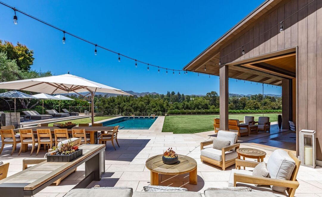 A stunning ultra-luxury poolside retreat seamlessly blending indoor and outdoor living with organic modern design. The space features a resort-quality saltwater pool, expansive stone patio, sophisticated covered pergola with string lighting, custom wood-paneled ceiling, and curated outdoor furniture arranged in intimate conversation zones, all overlooking manicured lawns and distant mountain vistas.