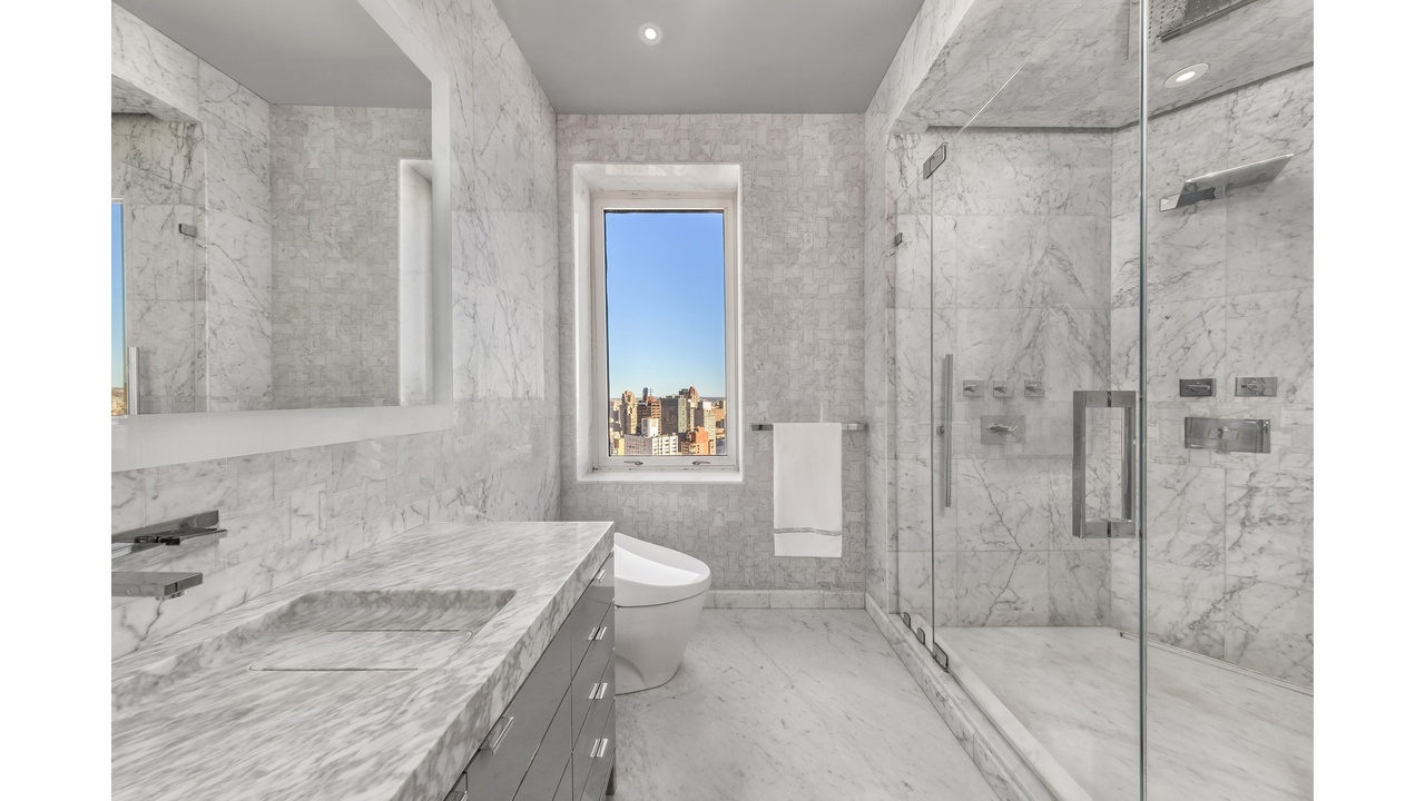 Floating VanityWalk In ShowerFrameless Glass ShowerDouble VanityMarble SurroundHigh CeilingsFloor To Ceiling WindowRecessed LightingMarble FloorCity View