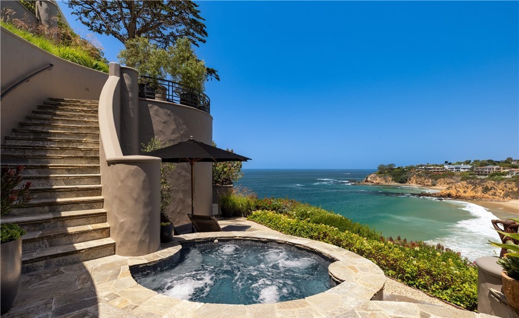 A breathtaking clifftop hot tub and lounge area perched above a pristine turquoise cove, featuring sculptural curved stone architecture with organic integration into the coastal landscape. The design harmonizes luxurious materials with the natural environment, creating a serene retreat with panoramic ocean views and seamless indoor-outdoor flow via dramatic cantilevered stairs.