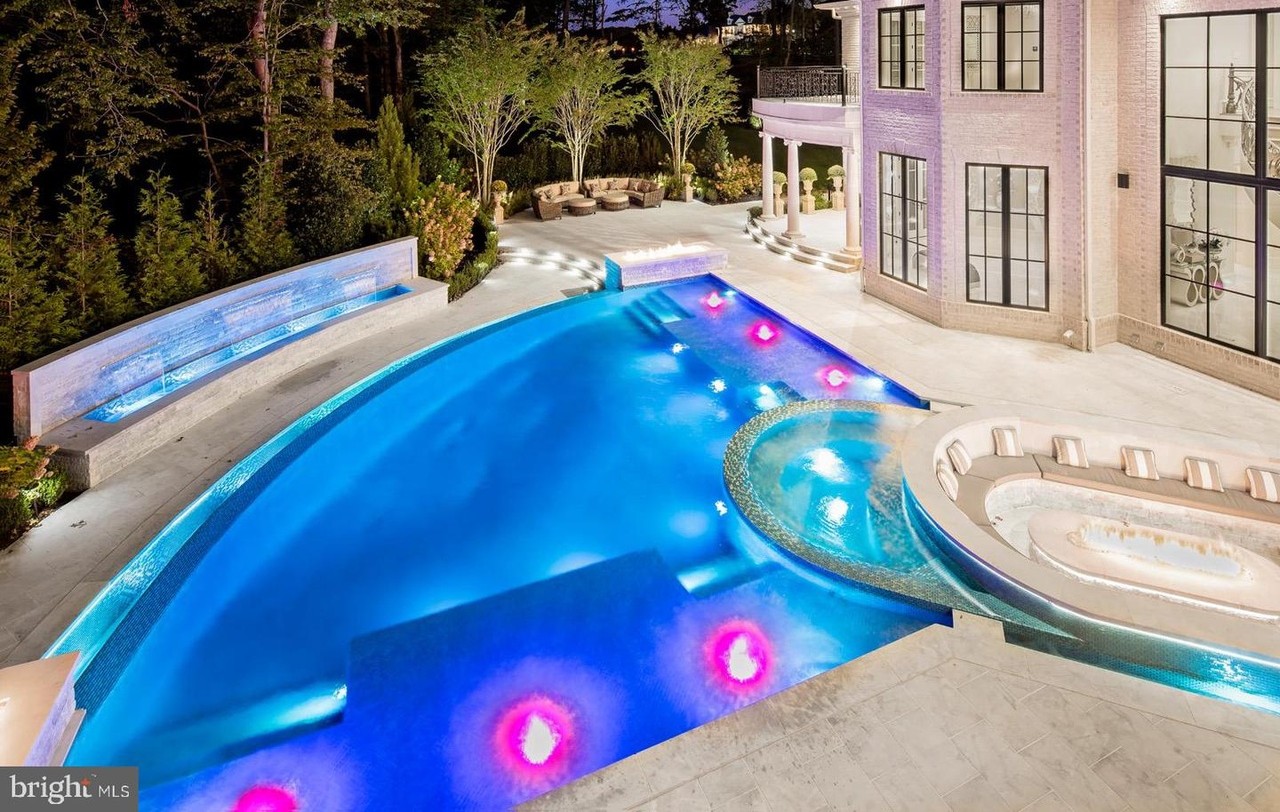 A resort-caliber backyard oasis featuring a stunning illuminated freeform pool with integrated hot tub and waterfall feature, accented by sophisticated mood lighting in jewel tones. The sophisticated composition combines clean architectural lines, premium finishes, and thoughtful landscape design to create an editorial-worthy luxury retreat.