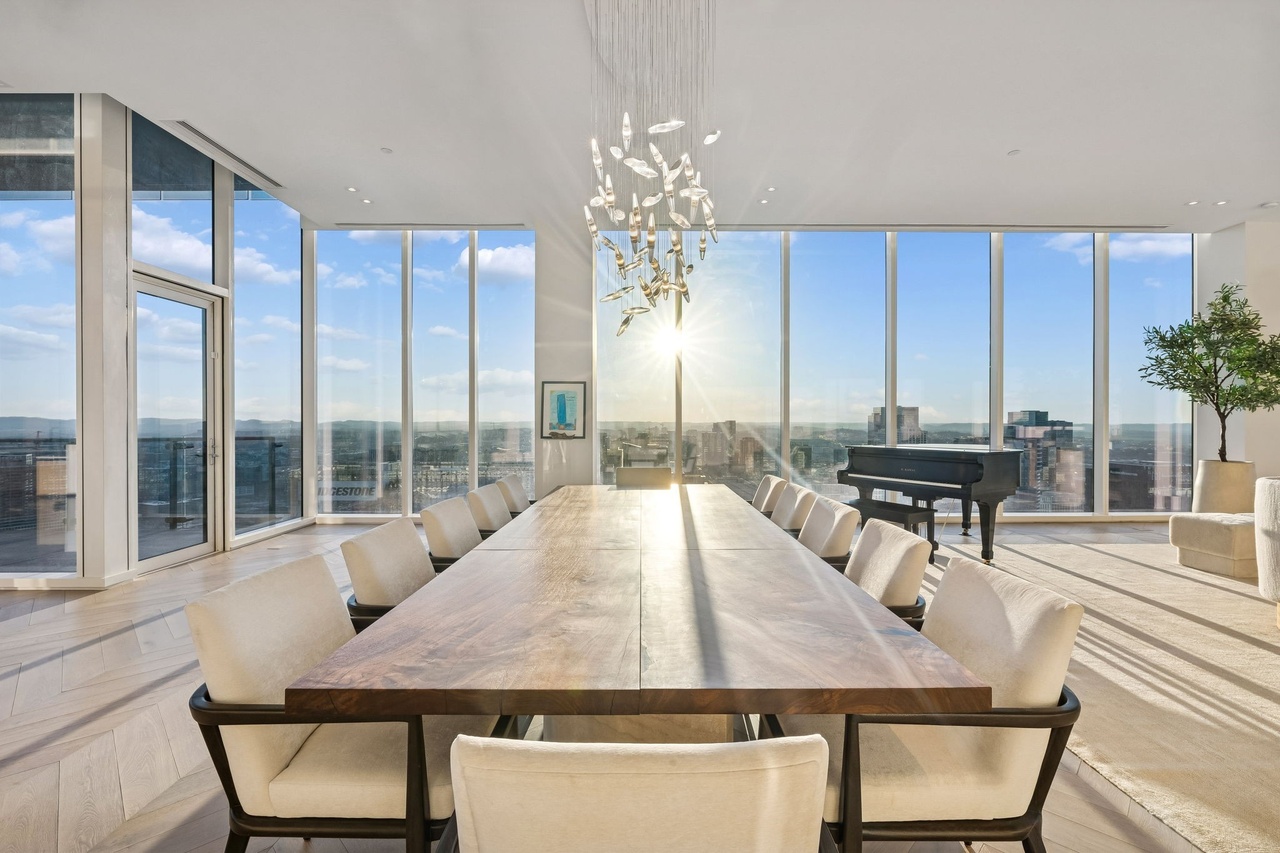 An exceptionally elegant high-rise dining room featuring floor-to-ceiling panoramic windows overlooking a metropolitan skyline, anchored by a sculptural light wood dining table with cream upholstered seating and a striking brass cascade chandelier. The space exemplifies modern luxury with abundant natural light, clean architectural lines, a grand piano, and a serene neutral palette that emphasizes the dramatic cityscape and minimalist sophistication.