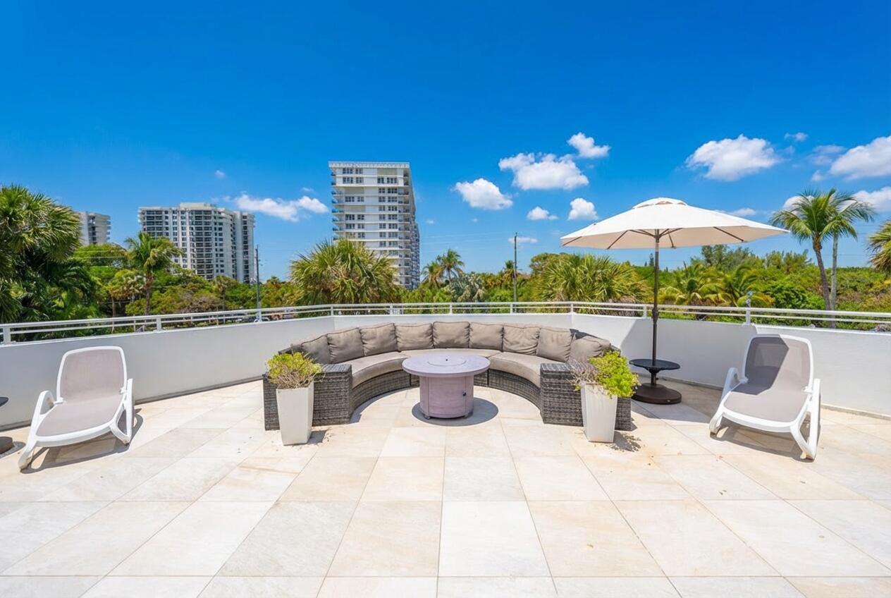 A sophisticated rooftop patio featuring a curved woven rattan seating area with cushioned seats arranged around a modern fire pit, overlooking tropical landscaping and high-rise residential buildings. The space exemplifies contemporary coastal luxury with abundant natural light, clean white railings, stone flooring, and thoughtfully curated furnishings that balance comfort with high-end design.