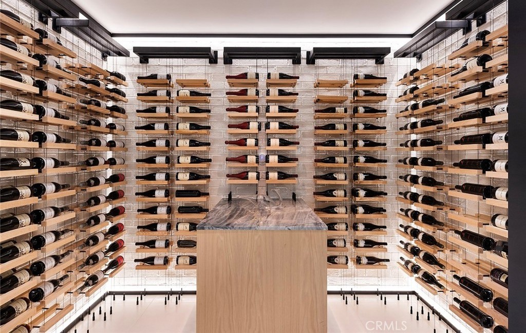 A stunning custom wine cellar featuring symmetrical floor-to-ceiling wooden wine racking on both sides with a sculptural marble-topped island centerpiece. The minimalist design with recessed lighting, neutral palette, and precision millwork creates an elegant, gallery-like environment that prioritizes both functionality and aesthetic refinement for serious wine collecting.