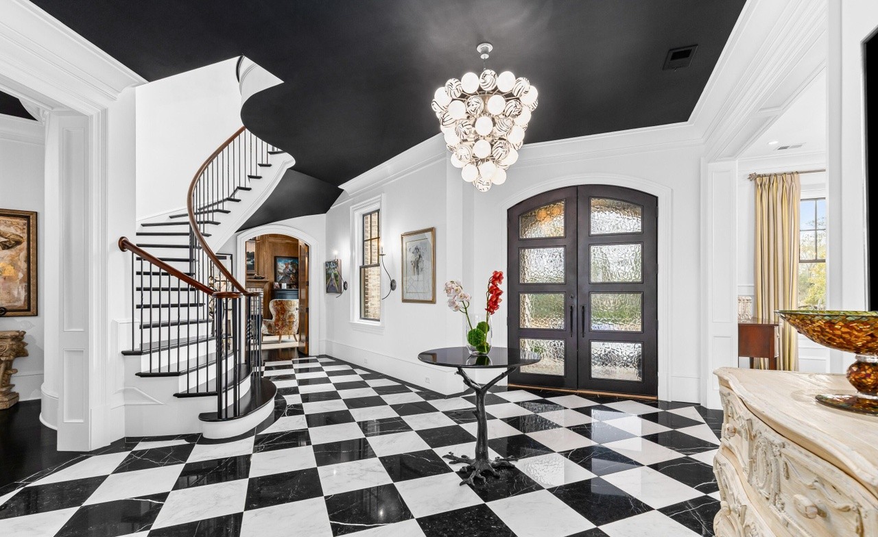 A stunning formal entryway featuring a striking black-and-white checkered marble floor anchored by an elegant spiral staircase with black metal railings and wood handrails. The soaring ceiling is painted a dramatic charcoal-black and crowned with an ornate white marble cluster chandelier, while pristine white walls with refined crown molding and custom millwork create an air of refined, timeless luxury reminiscent of pre-war New York elegance.