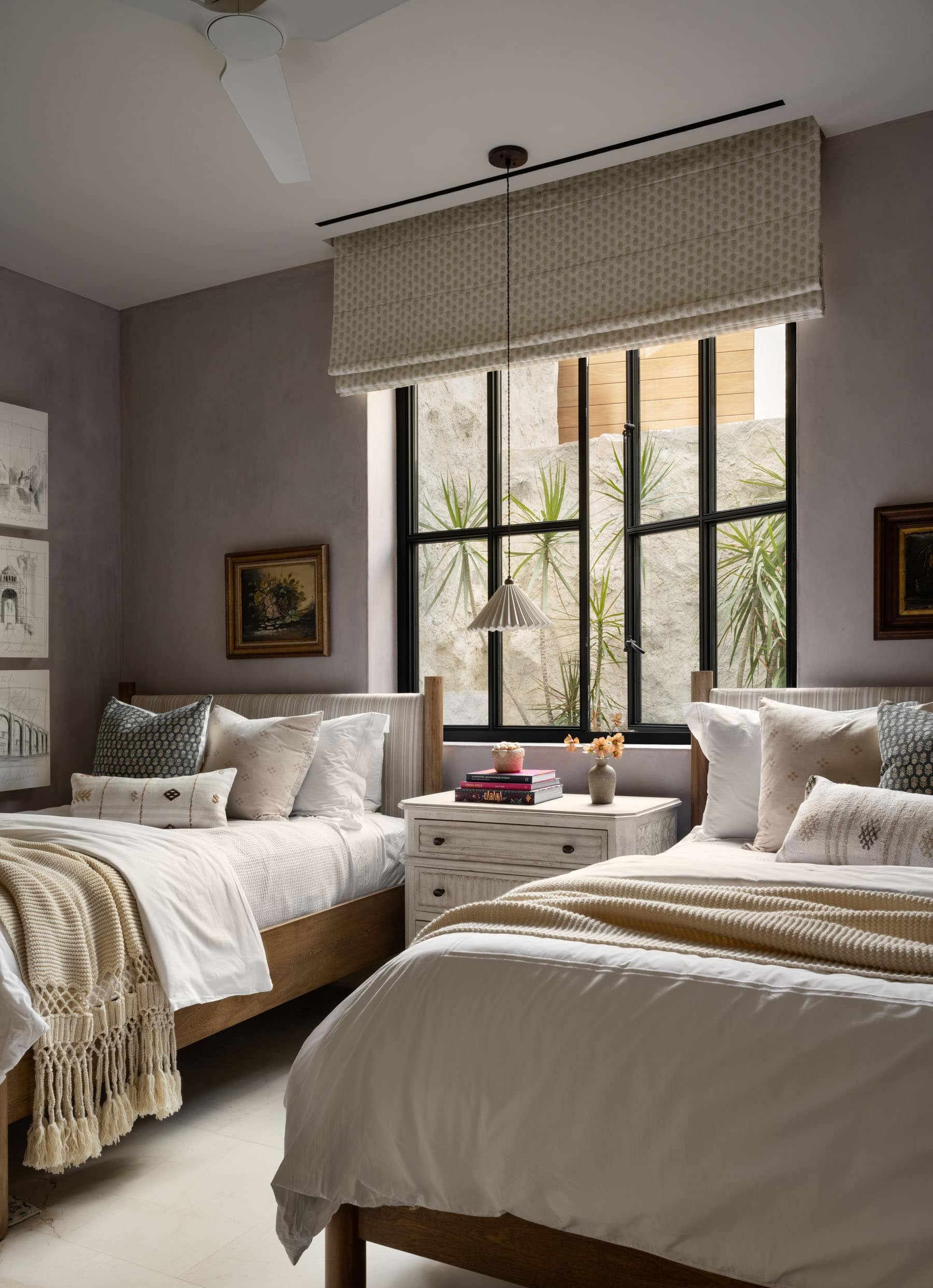 A sophisticated guest bedroom with twin beds features floor-to-ceiling black-framed windows that flood the space with natural light, complemented by layered neutral textiles and a modern pendant light. The warm wood bed frames and carefully curated art create an inviting, hotel-like atmosphere with gray walls and abundant natural greenery visible through the expansive windows.