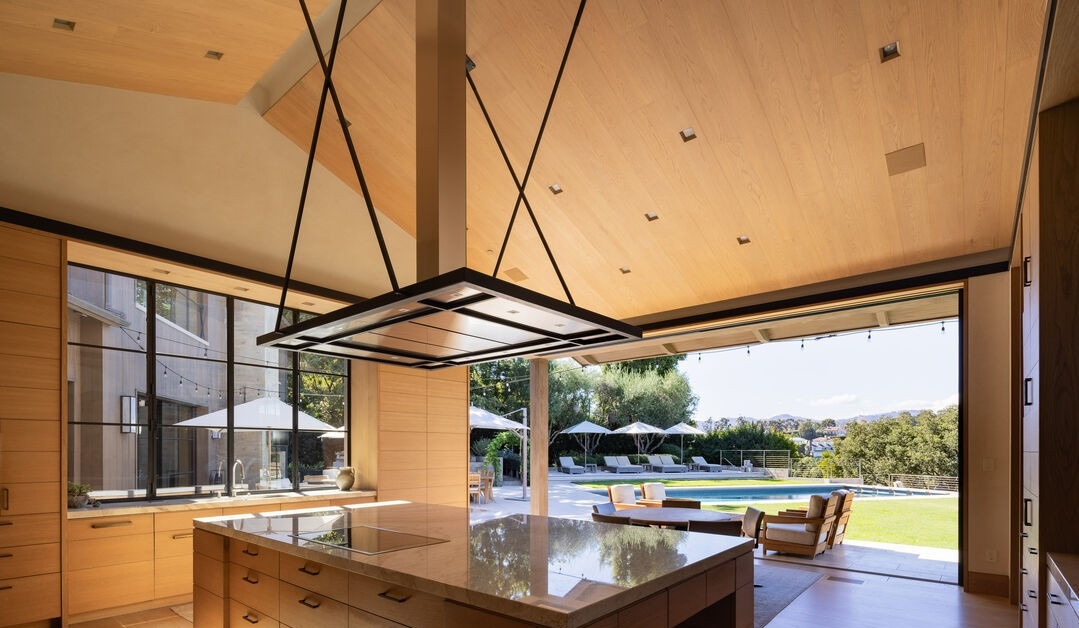 Waterfall IslandOpen ConceptFloor To Ceiling WindowsStatement LightingHigh CeilingsAbundant Natural LightIntegrated Outdoor ViewCustom MillworkIndoor Outdoor Flow