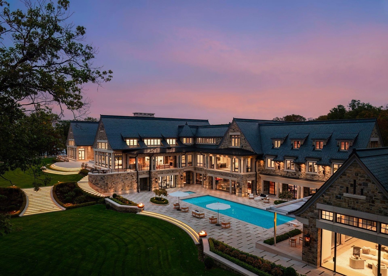 A spectacular sprawling resort-style pool compound featuring a heated saltwater pool and hot tub surrounded by elegant stone pavers, with a grand multi-wing mansion backdrop in contemporary New England architecture—complete with slate roofs, illuminated architectural elements, manicured lawns, and sophisticated outdoor entertaining spaces. The design seamlessly blends traditional stone construction with modern amenities and professional landscaping, creating an opulent private retreat.